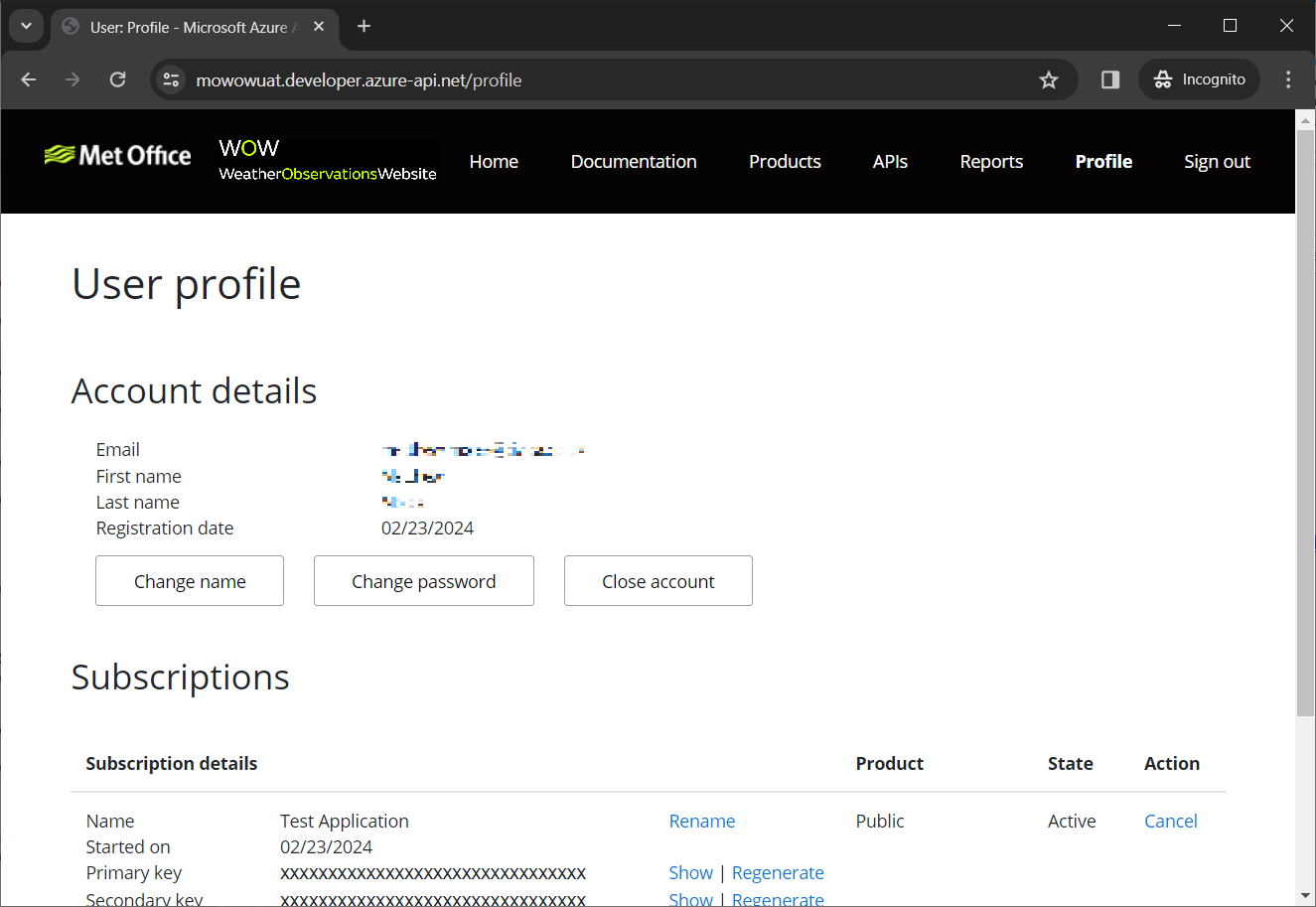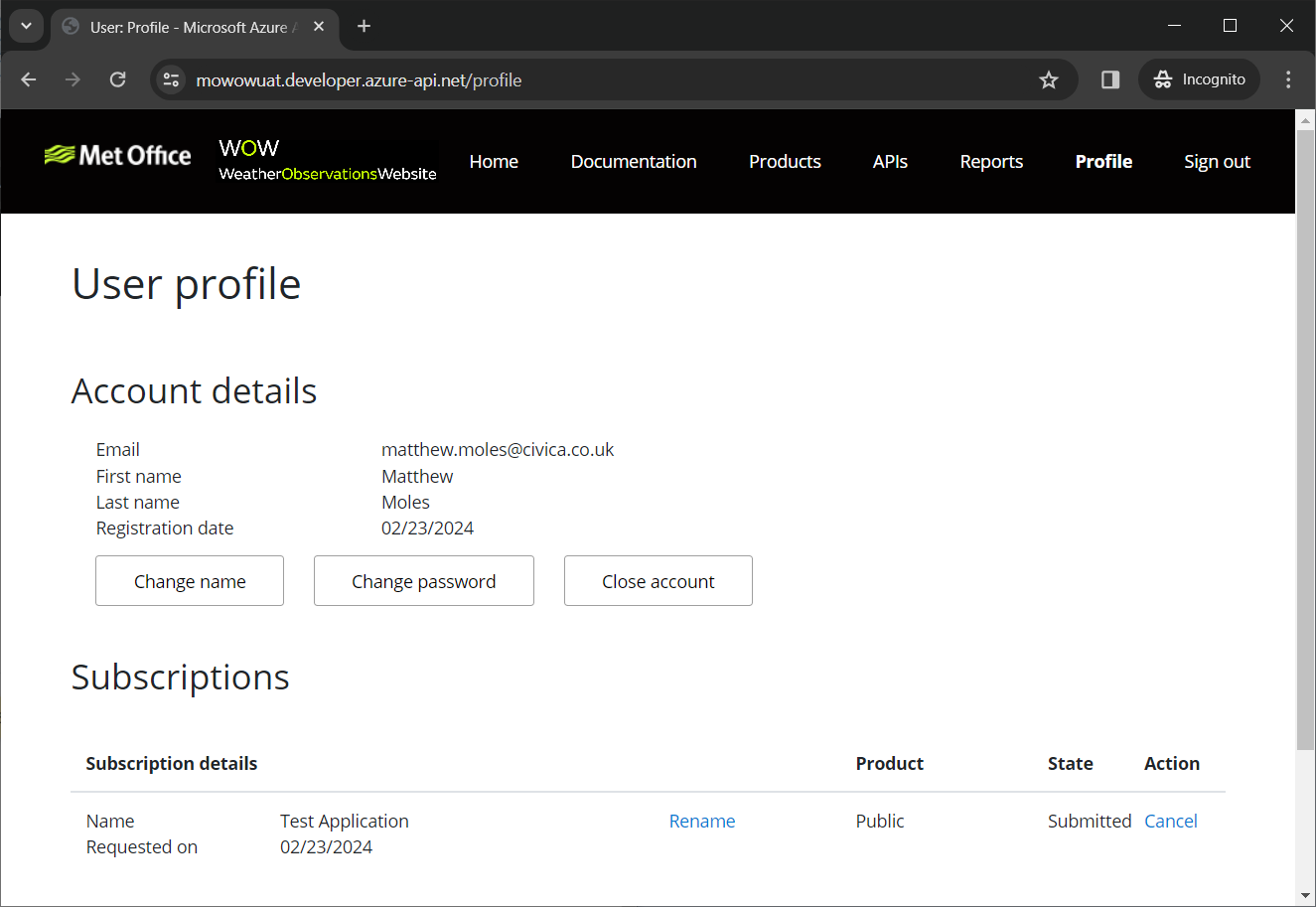 You can see that state is Submitted. When MetOffice confirms your request, you will be notified via e-mail. After that, you can visit your profile page again to get your subscription key.